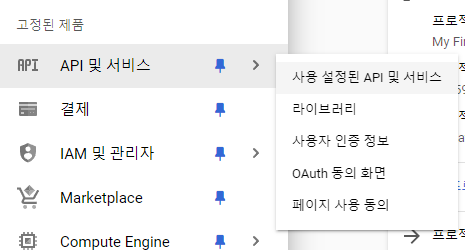 5. 해당 프로젝트의 대시보드로 와서 API 및 서비스의 사용설정된 API 및 서비스를 클릭한다.