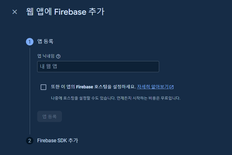 2. 어플리케이션의 닉네임을 정해주고 앱 등록을 눌러준다. → 파이어베이스에서 호스팅할거라면 체크를 해주고 아니라면 체크를 안해줘도 된다.