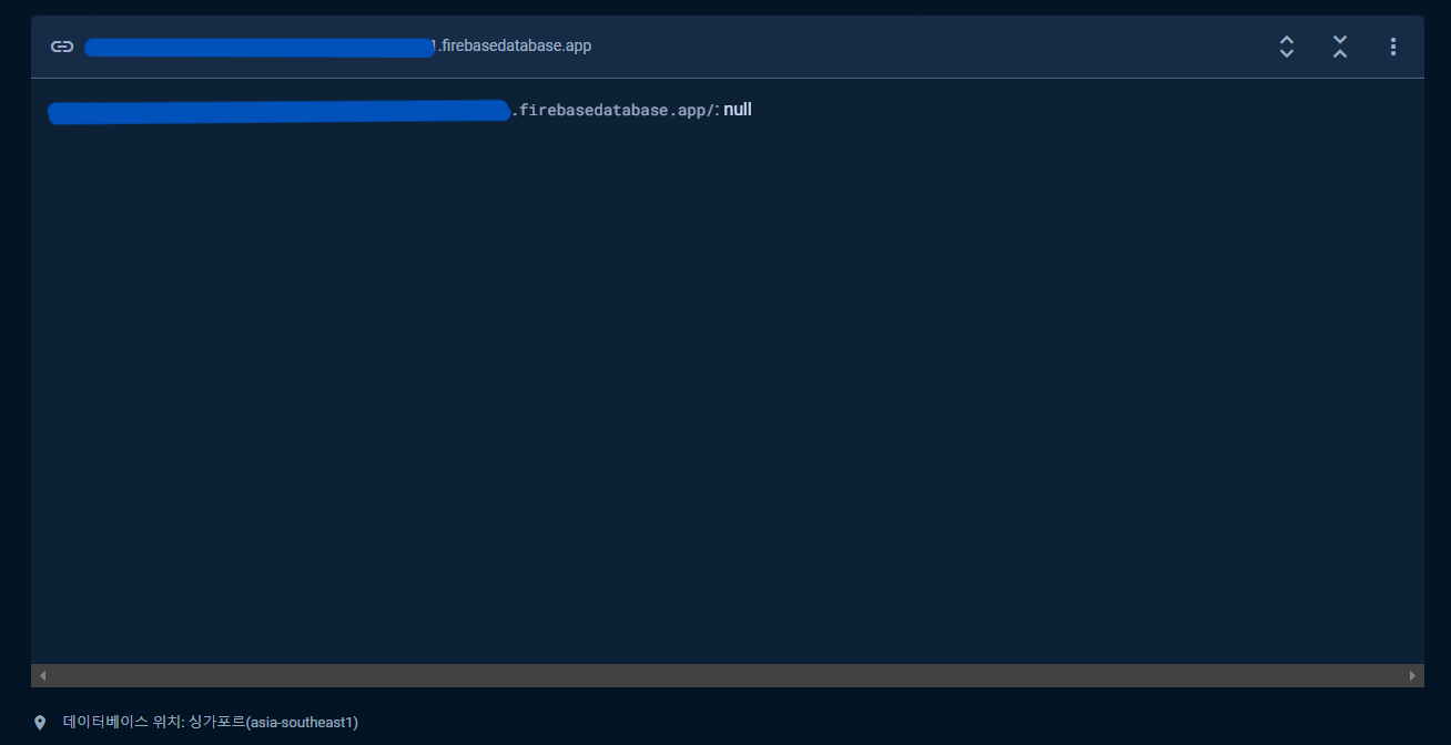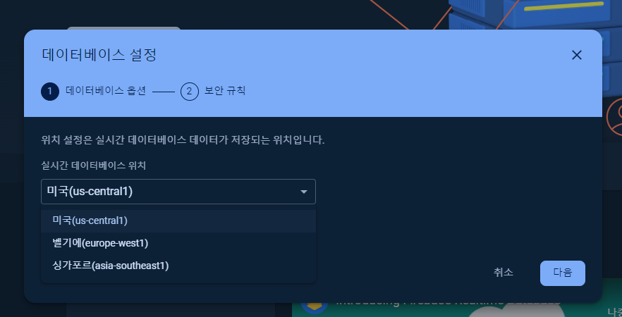 3. 데이터 베이스 설정을 해주는데 실시간 데이터베이스 위치는 내가 위치한 나라에서 가장 가까운 나라로 해준다. → 한국의 경우 싱가폴!